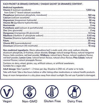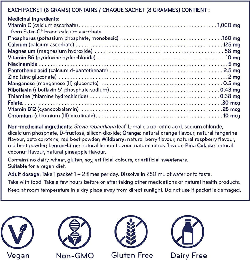 Low Calorie & Delicious; Naturally sweetened, low-calorie vitamin C drink mix with all-natural flavours; Vegan, non-GMO formula contains no dairy or gluten.
