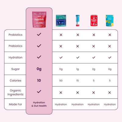 Gut health and hydration are interconnected and foundational to feeling your best. SuperBelly combines our love of superfoods with inulin fiber, trace minerals, fermented apple cider vinegar, and clinically studied probiotics that contribute to a healthy gut flora.