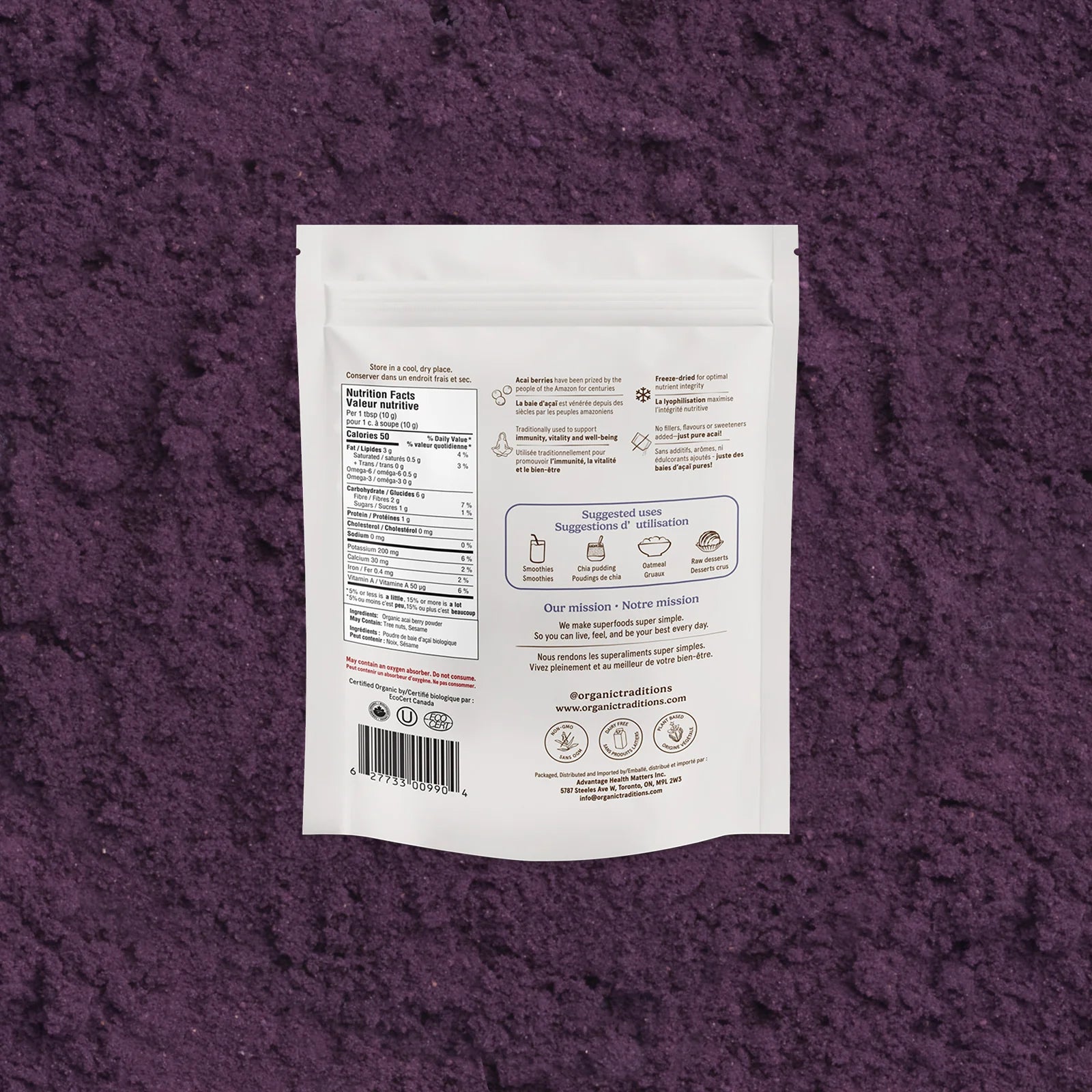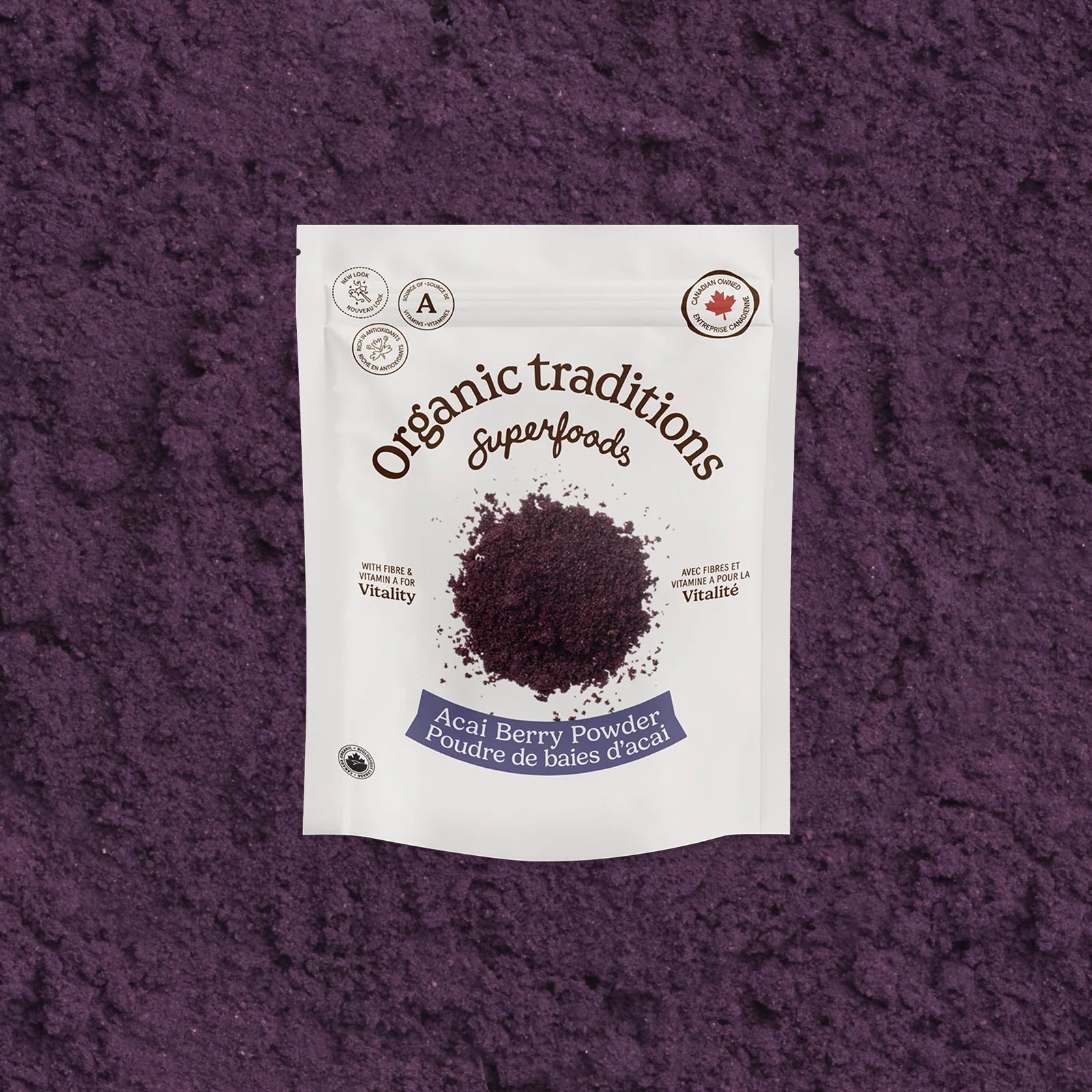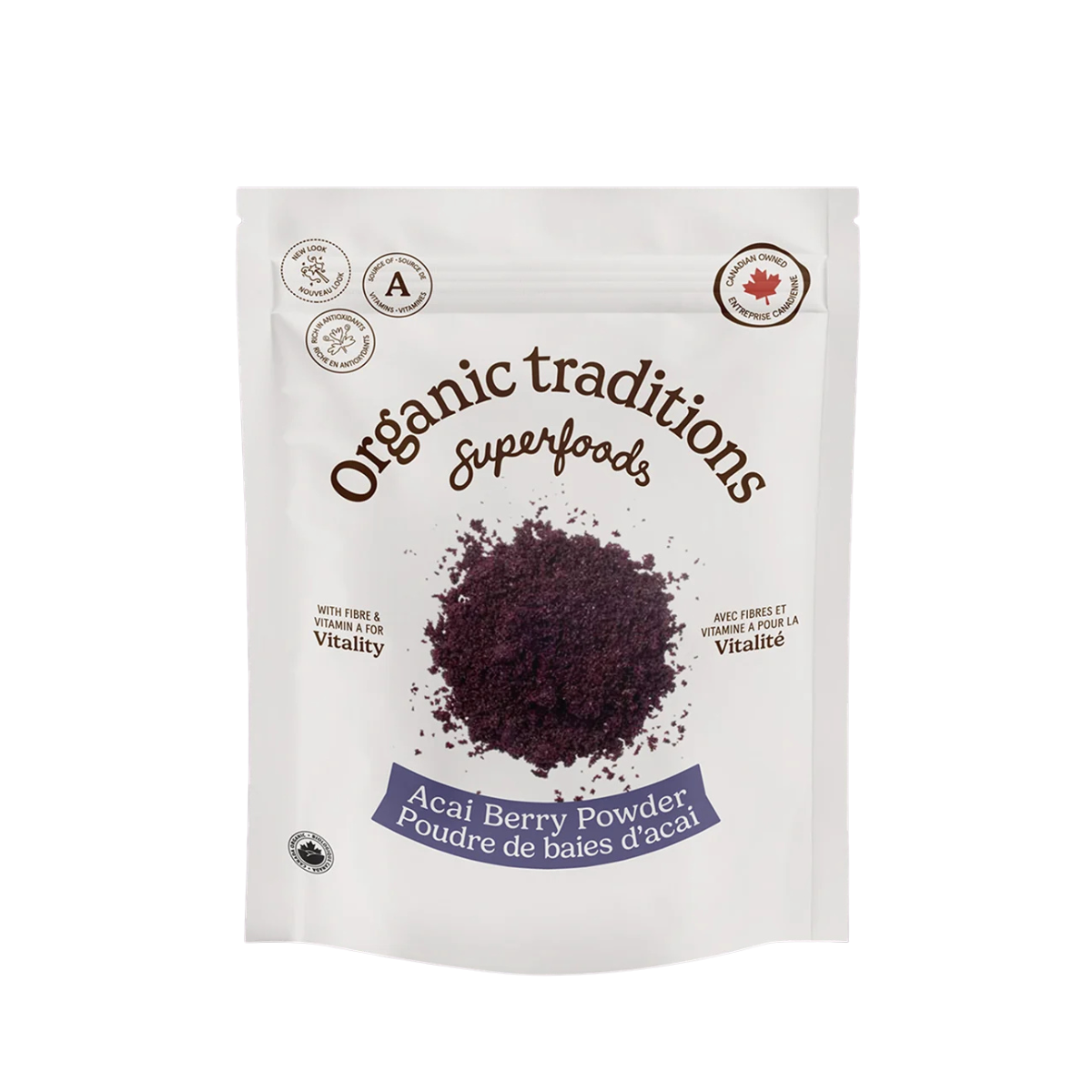 巴西莓 (Acai berry) 具有高度抗氧化的特性,含有花青素、多酚、植物营养素、植物固醇、Omega脂肪酸、胺基酸、膳食纤维及多种维生素和矿物质,可加强人体免疫及心血管系统功能,提供抗氧化保护,Organic Traditions 巴西莓粉没有填充剂、香料、添加甜味剂或麦芽糊精。