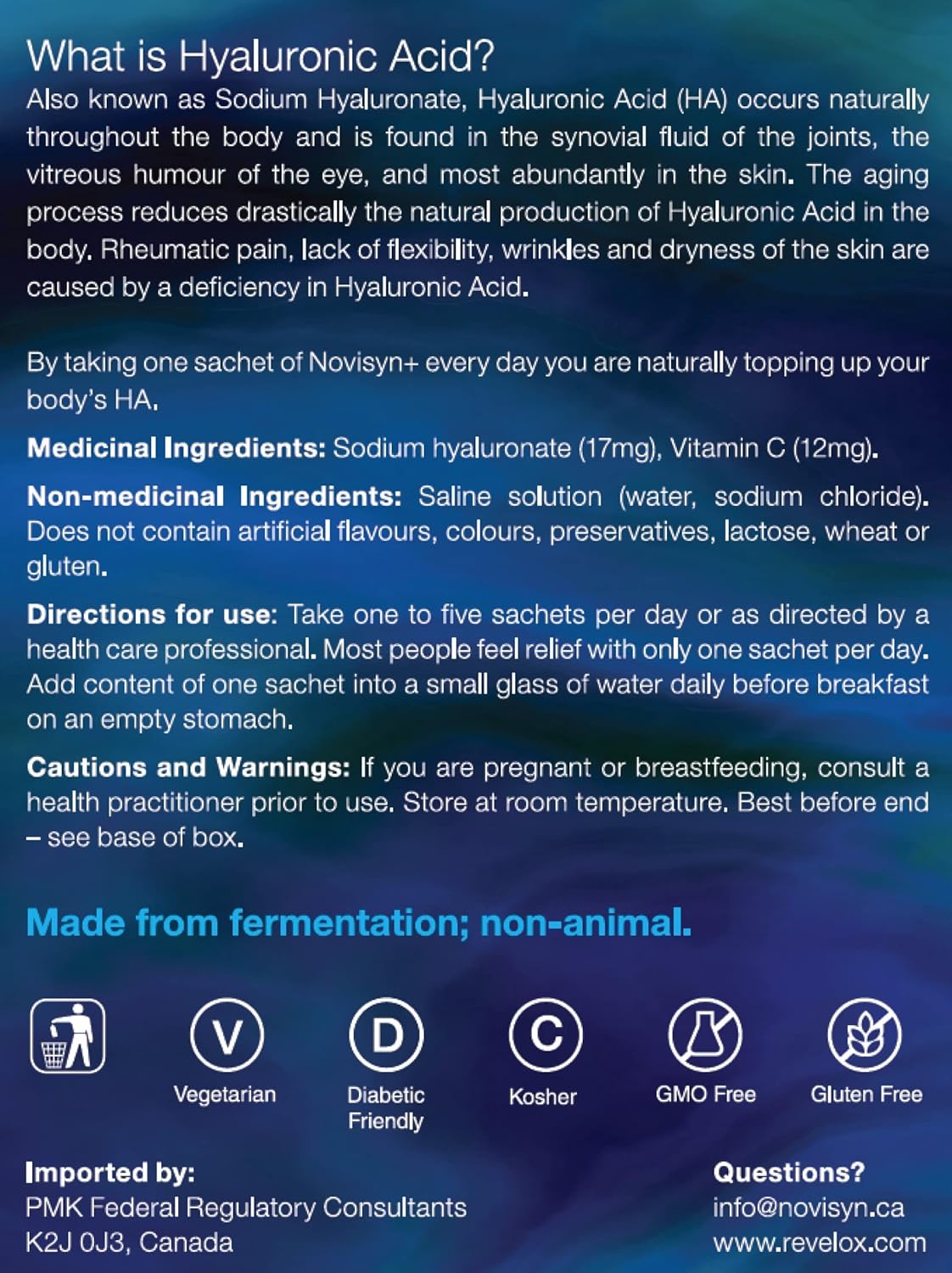 透明質酸在我們體內的壽命很短,因此,身體必須產生足夠的透明質酸,否則需要補充。 維持體內透明質酸的水平對於組織修復和重建非常重要。 隨著年齡的增長,透明質酸的水平會下降,膠原蛋白、彈性蛋白和纖維連接蛋白的產生也會減少。 皮膚將開始失去緊緻度和彈性,因此補充Novisyn口服透明質酸對於保持皮膚充滿活力和美麗至關重要。