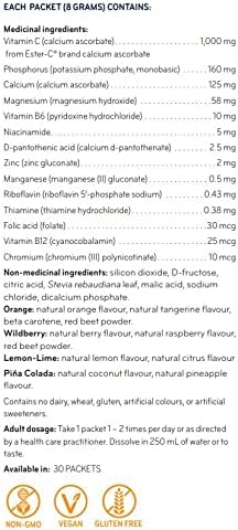天然甜味、低熱量的維生素C飲品粉,採用全天然口味;純素、非基改,不含乳製品與麩質。
