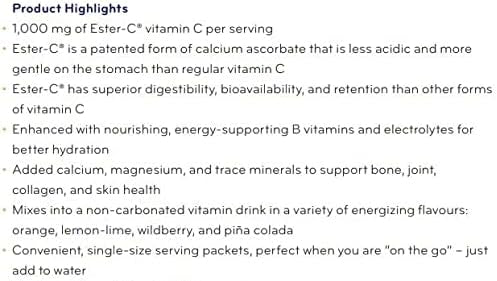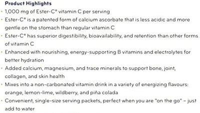 富含抗氧化劑的 Ester-C 配方可提供 24 小時免疫系統支持、提升水分補充效率並促進新陳代謝。