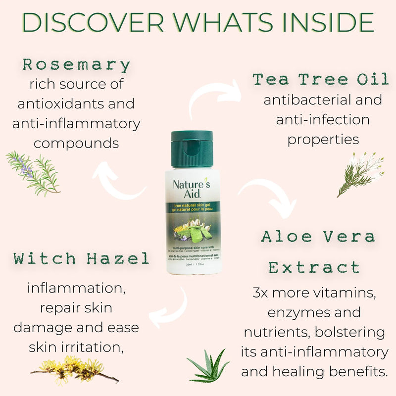 成分: 蘆薈(Aloe Barbadensis)葉萃取、純水(Aqua)、甘油(Glycerin)、金縷梅(Hamamelis Virginiana)萃取、迷迭香(Rosmarinus Officinalis)葉萃取、維生素E(Tocopherol)、茶樹(Melaleuca Alternifolia)葉油、尿囊素(Allantoin)、黃原膠(Xanthan Gum)、苯氧乙醇(Phenoxyethanol)、乙基己基甘油(Ethylhexylglycerin)、鹿角菜膠(Carrageenan)、卵磷脂(Lecithin)。