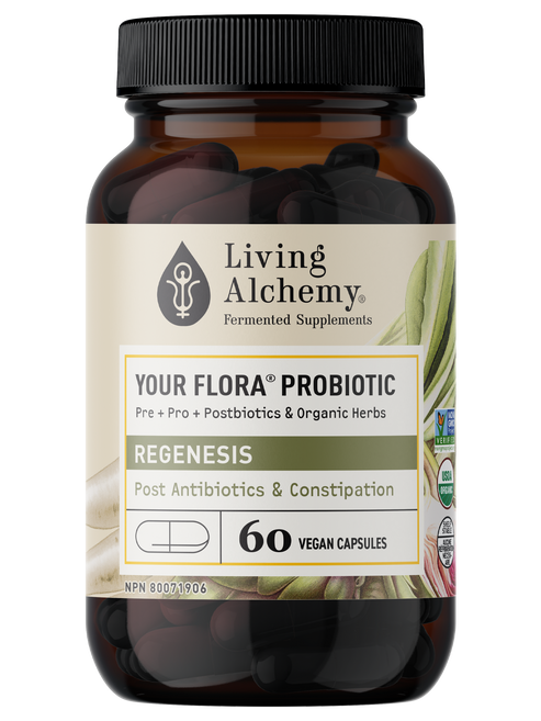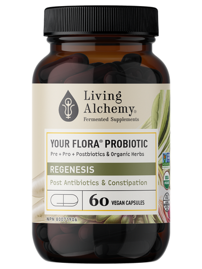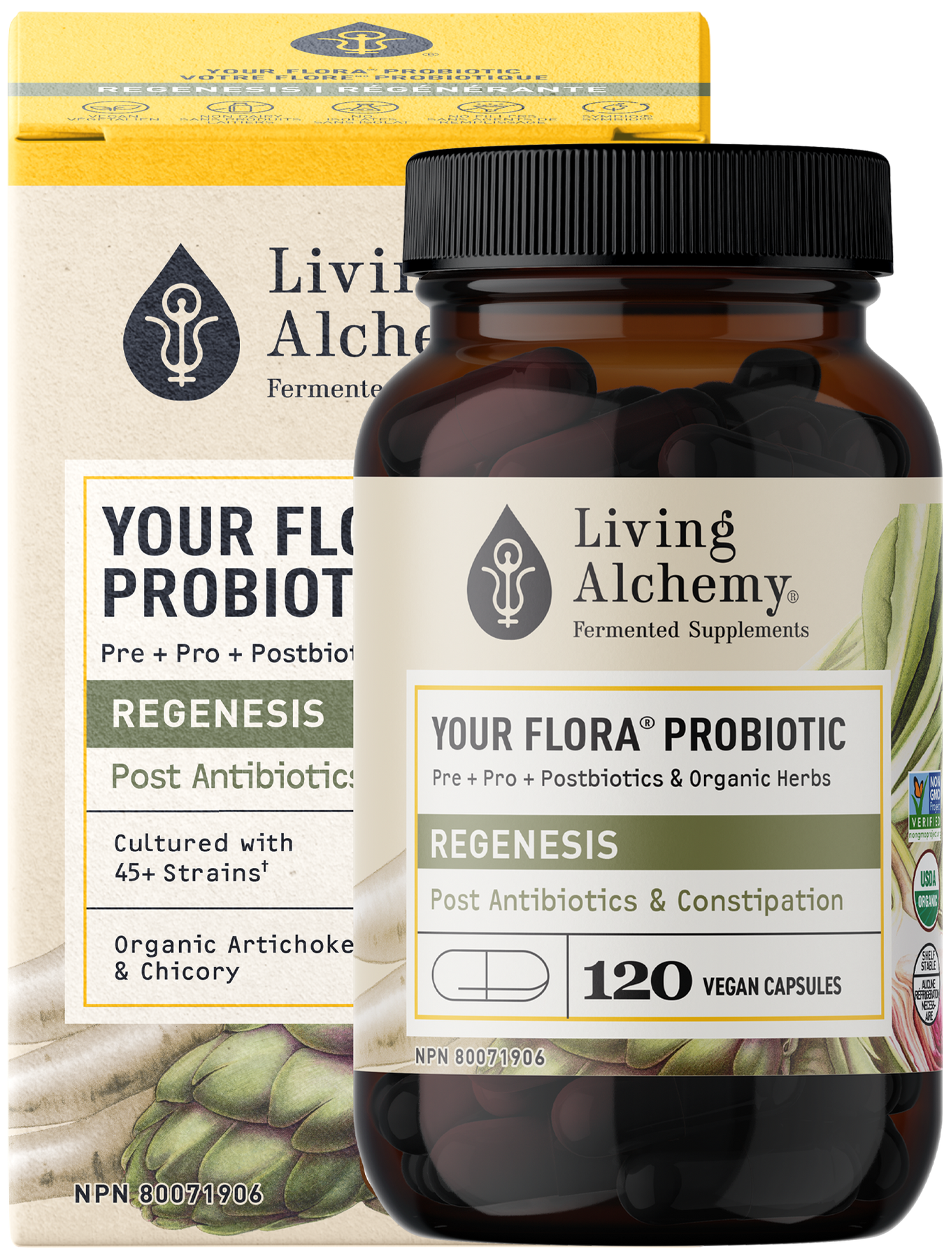 Your Flora Regenesis 聚合發酵益生菌-重整再生 是一種45多株多樣菌株的克非爾-康普茶發酵大豆共生配方,含有益生菌、益生元和後生元,有助於維持健康的腸道菌群。